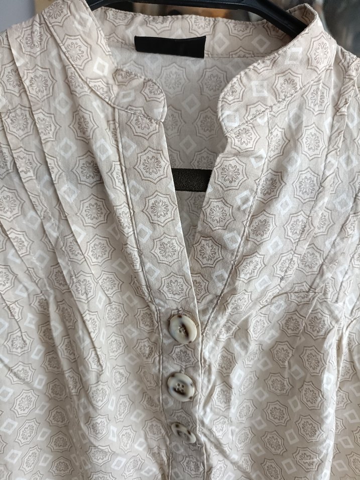 Uzun kollu, V yakalı bej keten gömlek, düğmeli ve normal kesimlidir. Vintage bohem tarzıyla ofis kullanımı için uygundur.