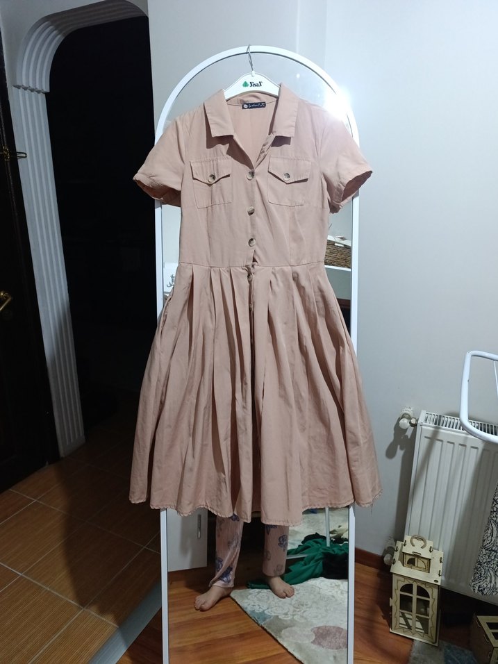 Bej V Yaka Düğmeli Kısa Kollu Kadın Gömlek elbise