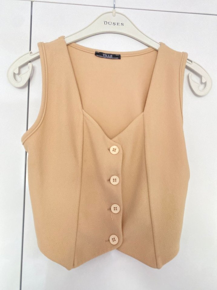 Bej V Yaka Düğmeli Kolsuz Mini Yelek