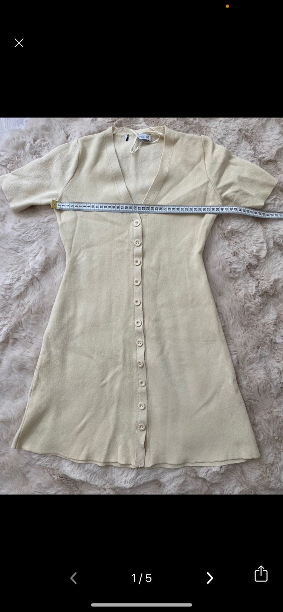 Bej renkte, V yakalı, kısa kollu, düğmeli ve triko kumaştan midi boy elbise. Vücuda oturan kesimiyle günlük kullanım için uygundur.