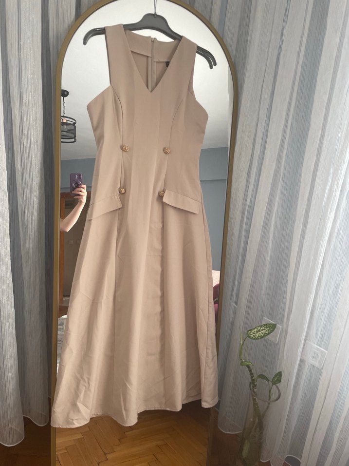 Bej rengi, V yakalı ve düğmeli uzun kolsuz elbise. Yumuşak sentetik kumaştan üretilmiş, ofis kullanımı için uygun rahat kesim. İade kabul edilmemektedir ürün bikere giyildi