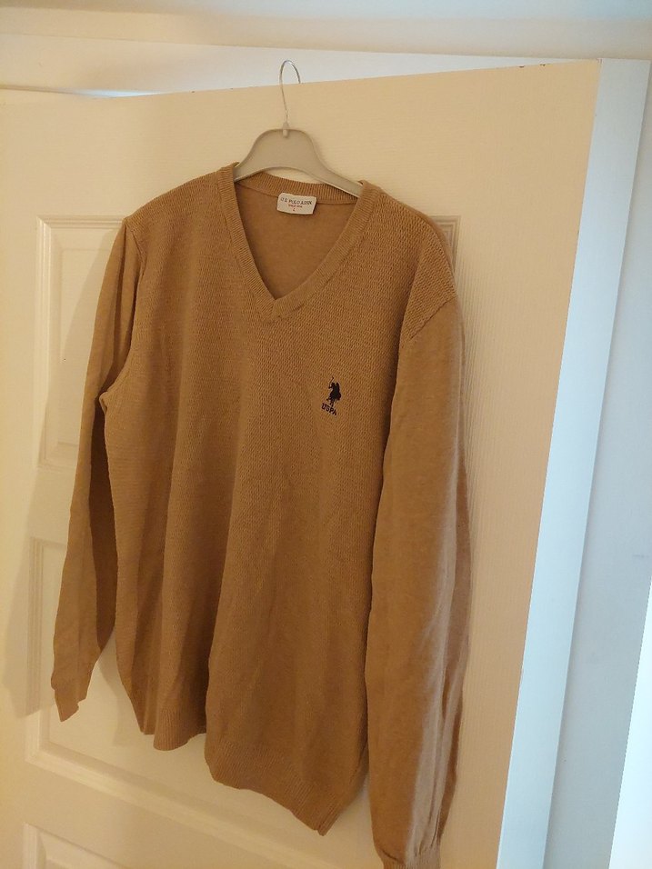 Bej renkli, V yaka, uzun kollu yumuşak yün erkek triko kazak. Rahat kesimi ve günlük kullanıma uygun tarzı ile dikkat çeker.