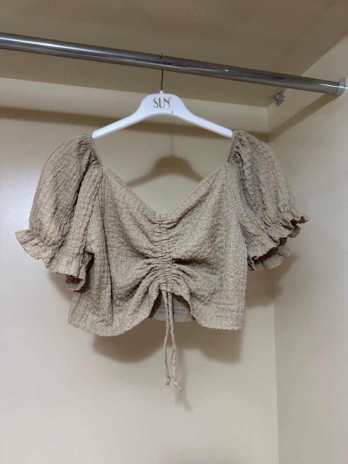 Bej keten bluz, V yaka ve askılı kollarla, fırfır detaylı ve bol kısa kesime sahip. Nakışlı, rahat bohem tarzda.