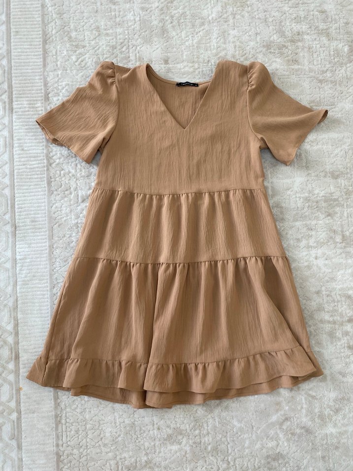 Yumuşak keten kumaştan, V yaka ve fırfır detaylı bol kesim bej midi elbise. Kısa kollu, bohem tarzda günlük kullanım için uygundur.