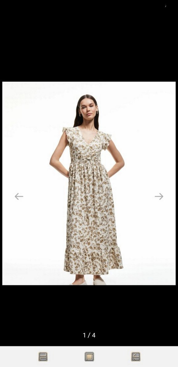 V yakalı, fırfırlı detaylı, bej tonlarında hafif batik desenli, sentetik yumuşak kumaştan, kolsuz uzun bohem elbise. Rahat ve bol kesim.