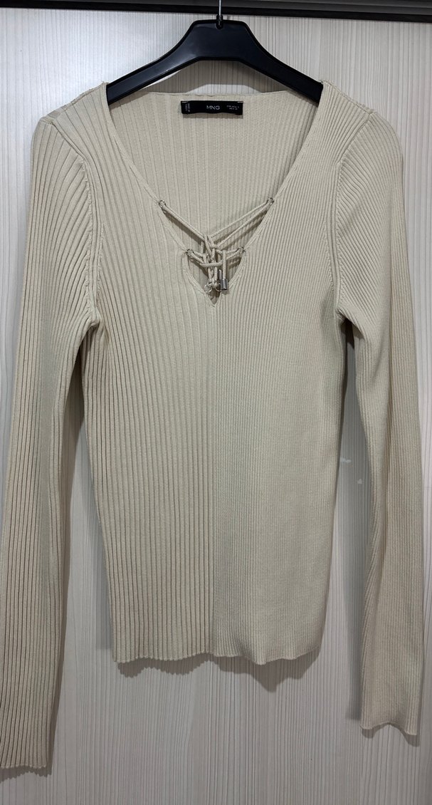 Bej renkli, uzun kollu, V yaka ve bağcıklı detaylı fitilli örme kadın kazak. Yumuşak örme kumaştan, günlük rahat kullanım için uygun uzunlukta. Sıfır ürün Mango markalı large beden Bej rengi