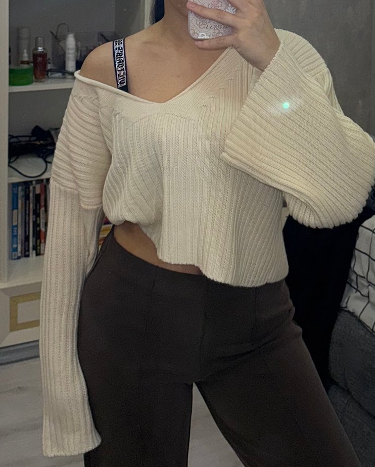 Bej renkte, V yaka ve uzun kollu, fitilli triko kumaştan yapılmış kısa kesim kadın kazak. Rahat ve şık, günlük sokak stili için uygundur.