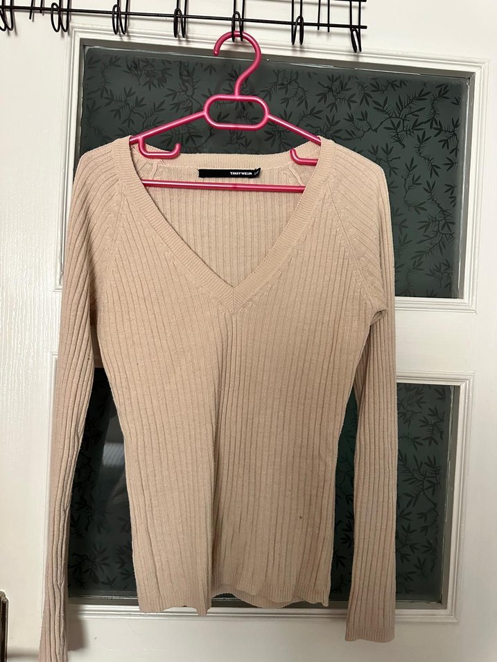 Bej renkte, V yaka ve uzun kollu kadın kazak. Yumuşak triko dokusu ve vücuda oturan kesimiyle günlük ve rahat kullanıma uygundur.
