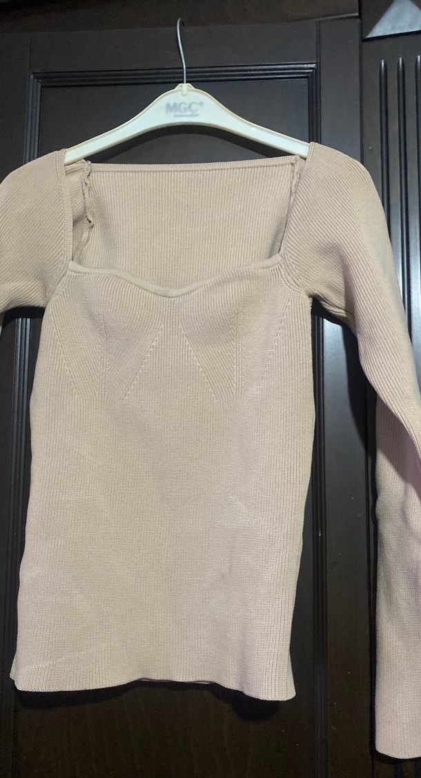 Bej renk, V yaka ve uzun kollu ince triko kumaştan yapılmış, vücuda oturan kadın kazak. Günlük rahat sokak stili için uygundur.