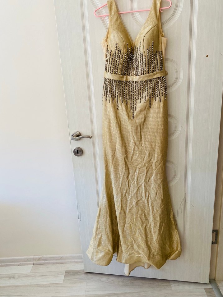 Bej renk, V yaka, kolsuz, işlemeli detaylarla süslenmiş uzun ve drapeli, dar kesim abiye elbise. Vintage bohem tarzda, düğün için uygun. ✨
