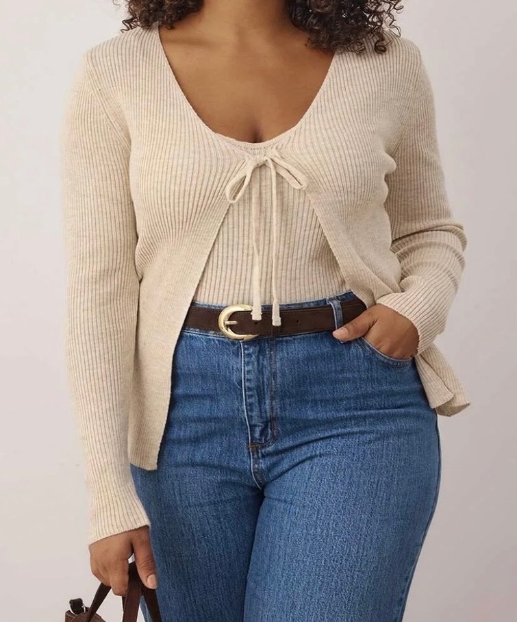 Bej renkli, V yakalı ve kemer detaylı fitted kesim kadın kazak. İkili takım uzun kollu ve normal boyda, günlük kullanıma uygun.