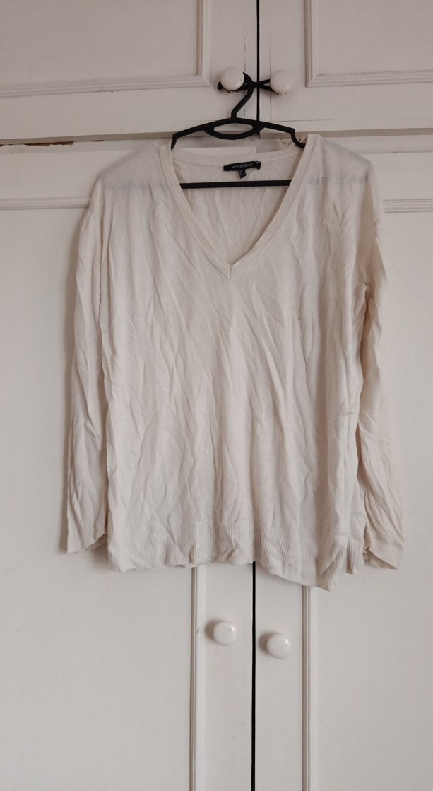 Bej keten kumaştan, V yaka ve uzun kollu, rahat kesim ve normal boyda günlük kullanıma uygun kadın kazak.