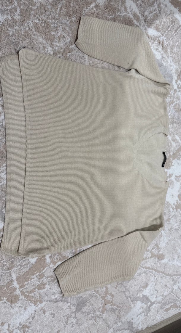 Bej renkli, V yakalı ve keten dokulu, rahat kesim kadın triko kazak. Uzun kollu ve desen içermeyen sade tasarımıyla günlük kullanıma uygundur.