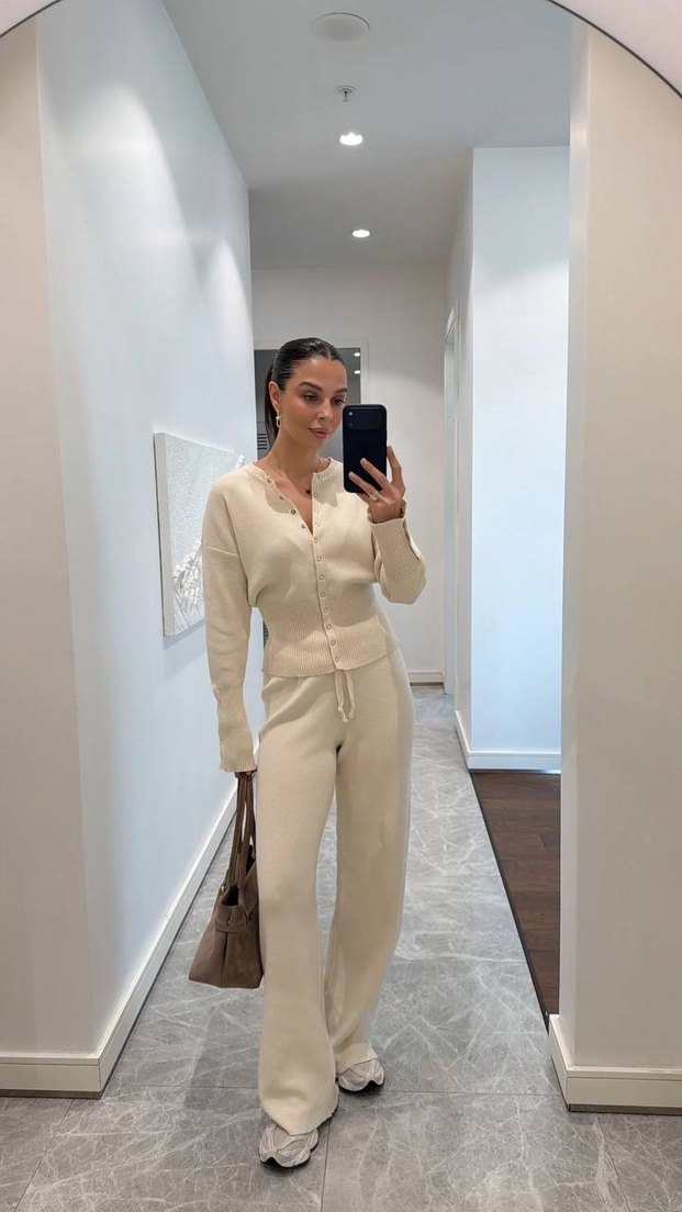 Uzun kollu, V yakalı, bej pamuklu kadın takımı. Normal kesim ve midi boy ile trend rahat şıklık sunar.