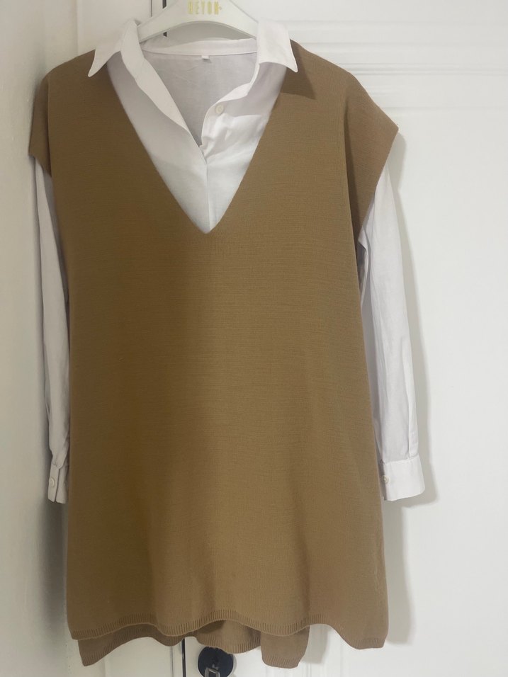Bej renkte, kolsuz ve V yakalı bu süveter, rahat kesimi ve yumuşak sentetik kumaşıyla günlük kullanıma uygundur.