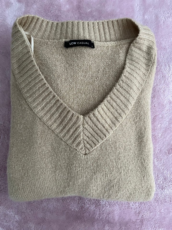 Bej renkli, V yakalı, uzun kollu kadın triko kazak. Rahat kesimli ve desensiz, günlük kullanıma uygun basit tasarım. Oversizedir.