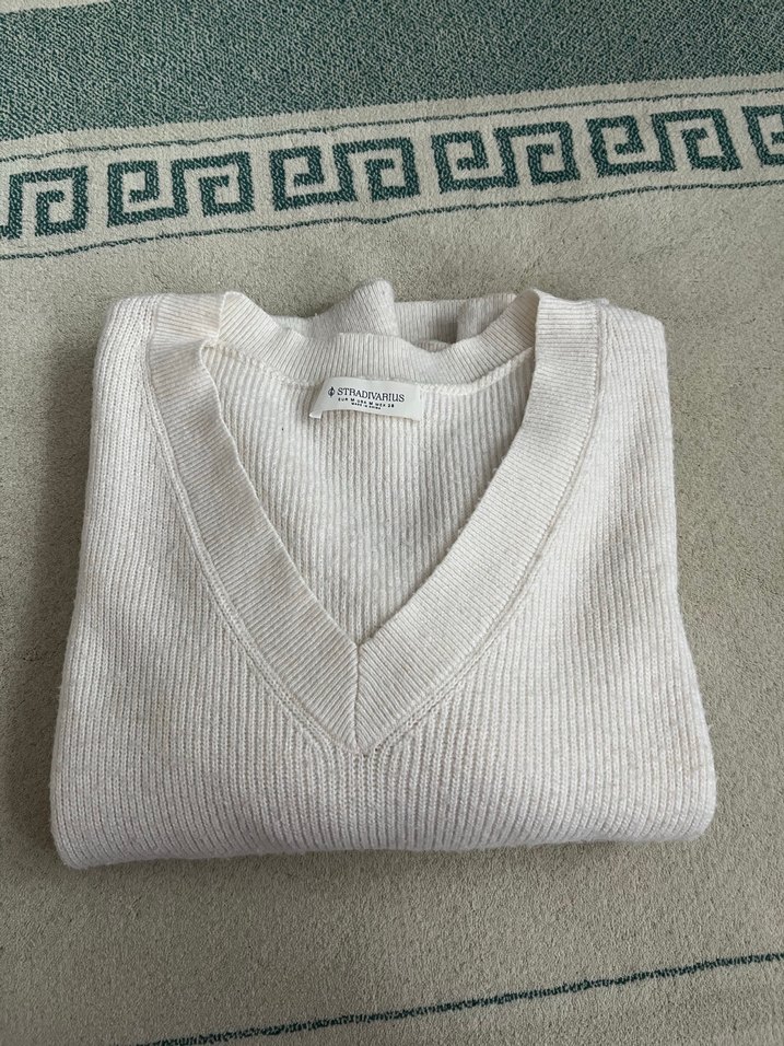 Bej renkli, V yakalı ve uzun kollu kadın triko kazak. Yumuşak yünden örülmüş, rahat ve midi boyda, gündelik kullanıma uygun.