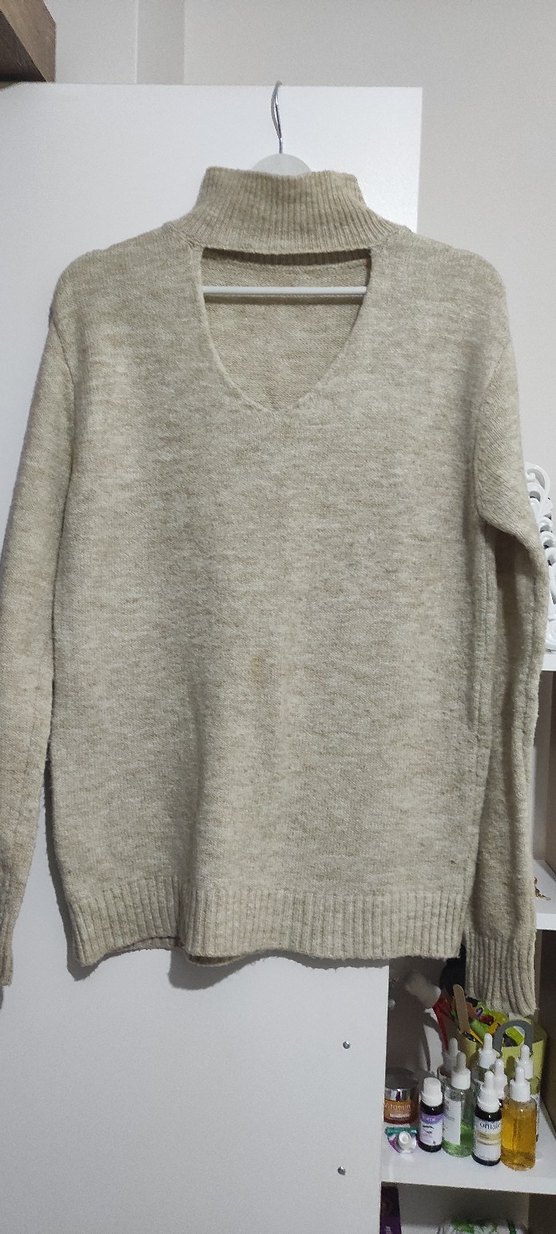 Bej renkte, V yakalı, uzun kollu ve bol kesim normal uzunlukta kadın triko kazak.