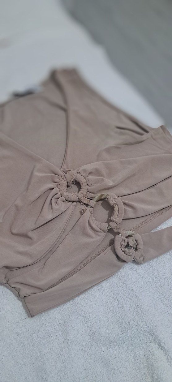 V yaka, kemerli ve askılı kısa bej bluz. Düz desensiz, sentetik kumaştan, sokak stiline uygun.