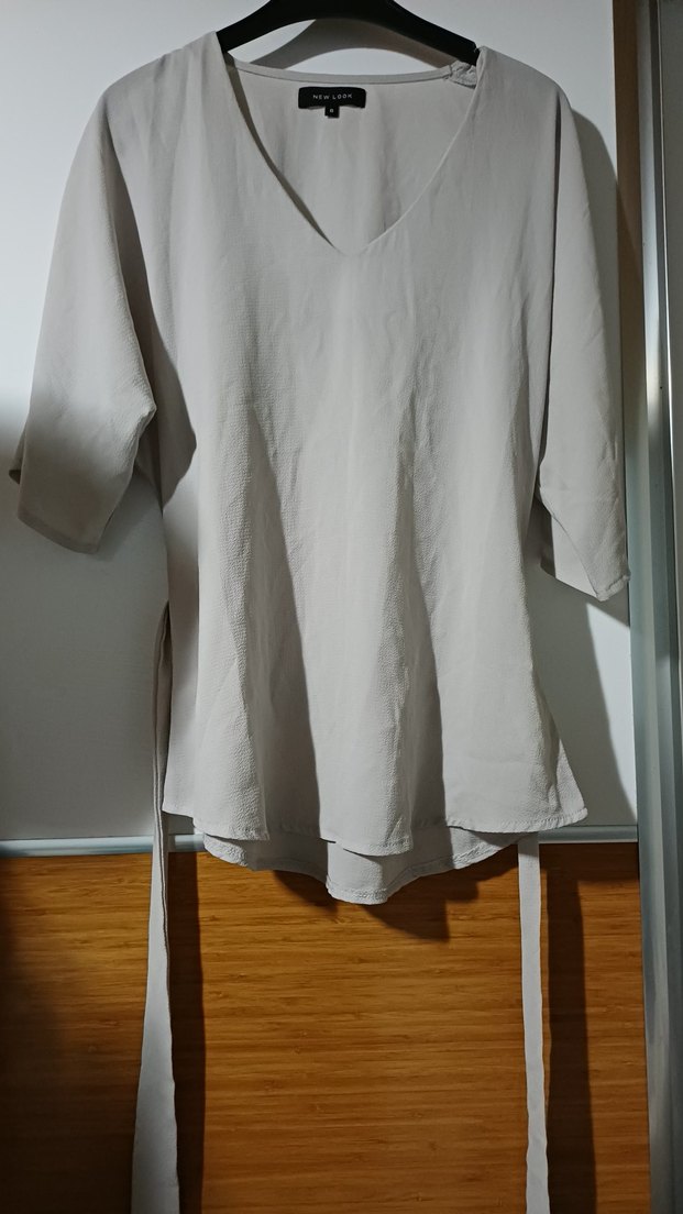 V yakalı, kısa kollu, keten kumaştan yapılmış bej renkli bol kesim bluz. Drapeli ve midi boy, sade günlük kullanım için uygun.