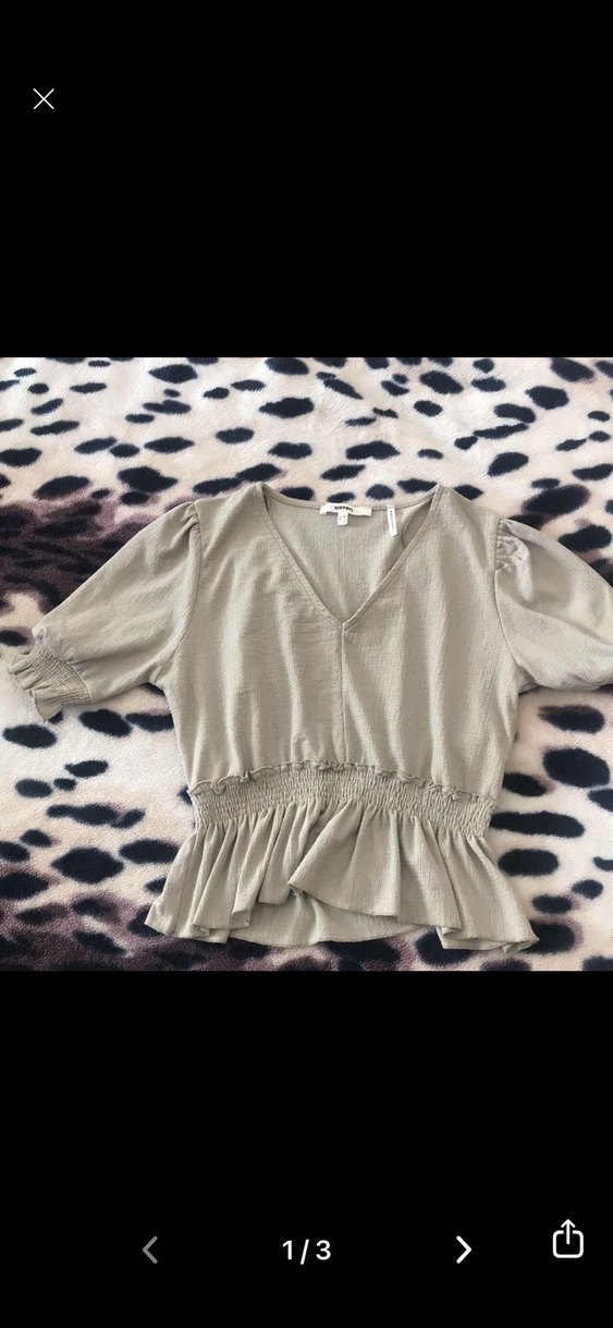 Bej keten kumaştan, bol kesim, kısa kollu, V yakalı ve fırfırlı detaylı kadın bluz, rahat sokak stili için uygun.