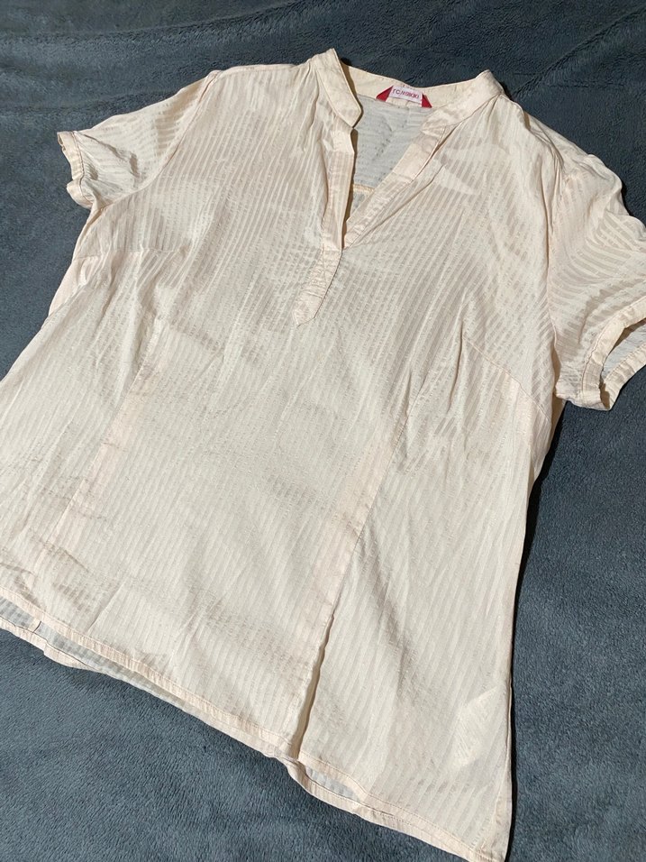 Bej keten gömlek, kısa kollu ve V yakalıdır. Salaş kesimi ve pile detaylarıyla bohem tarzda, günlük kullanıma uygundur.