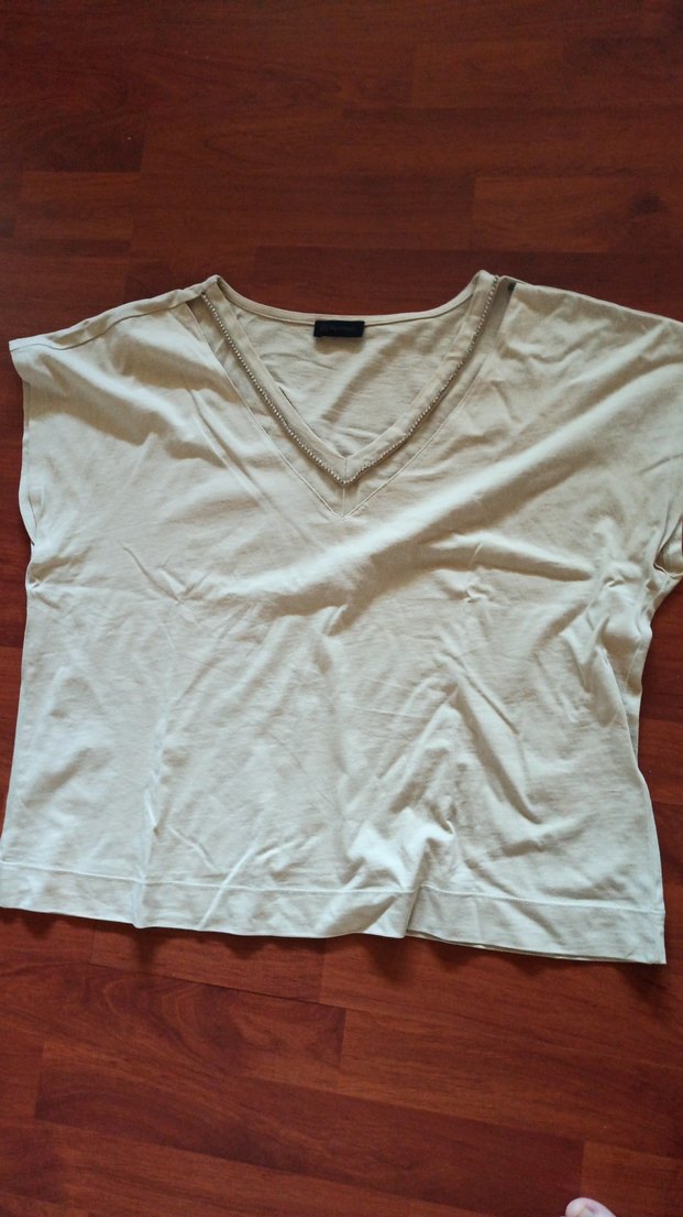 Bej renkli, keten kumaştan, V yakalı, tas ve tül detayl ikısa kollu ve bol kesim kadın tişörtü, günlük rahat sokak stili için uygundur.