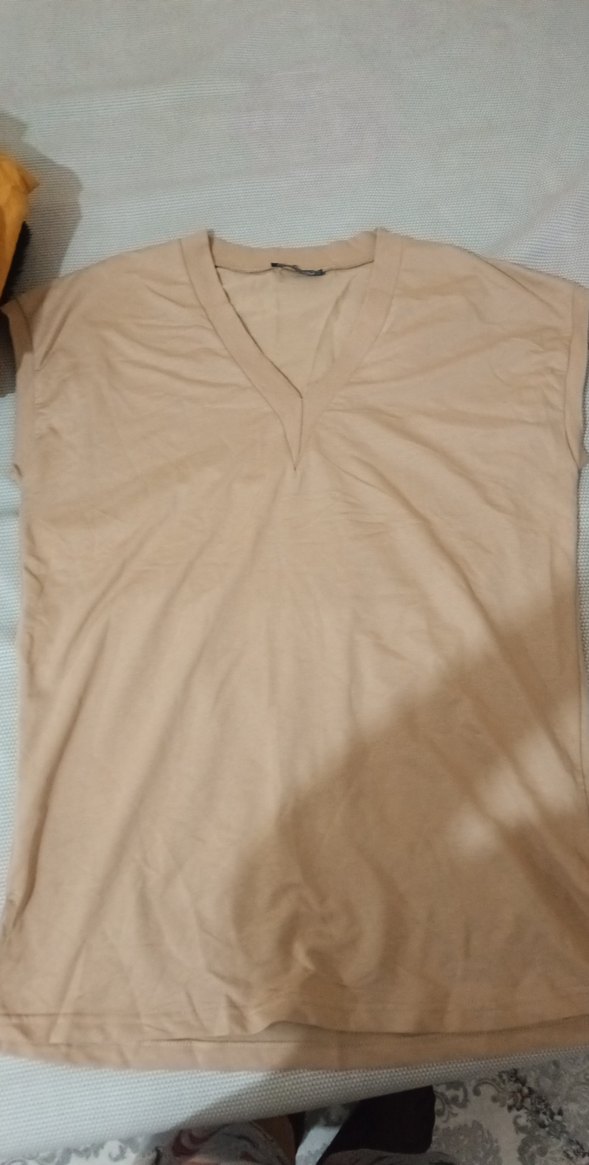 Bej renkli keten kumaştan, V yaka ve kısa kollu, rahat ve bol kesim kadın tişörtü, günlük kullanım için uygundur.