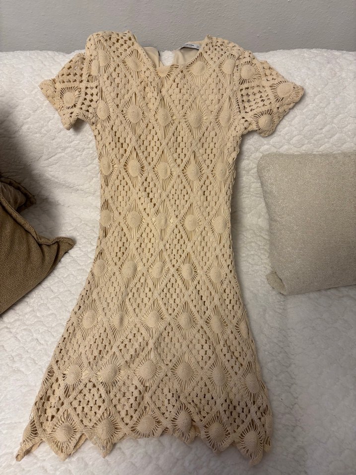 Bej renk, v yaka, kısa kollu, midi uzunlukta, bohem tarzda triko elbise. Rahat ve yumuşak dokulu, vücuda oturan kesime sahip.