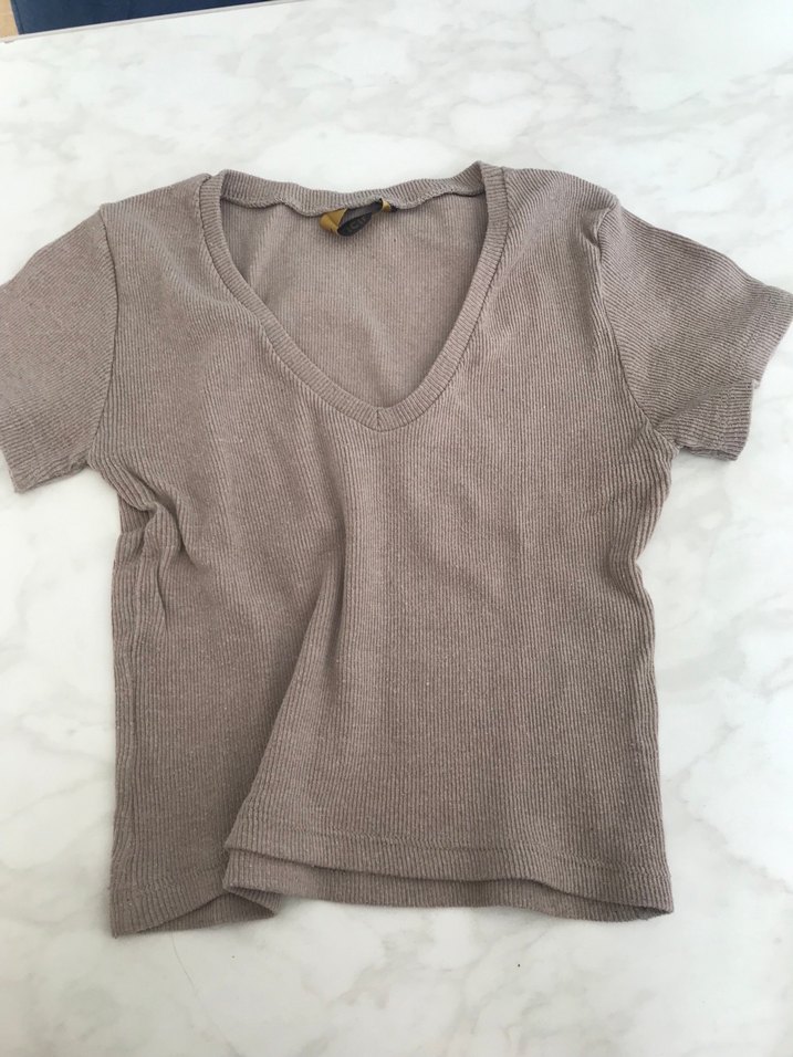 V yaka ve kısa kollu,bej-gri tonlarında, sade ve desen içermeyen, rahat ve şık günlük kullanıma uygun kadın bluzu.