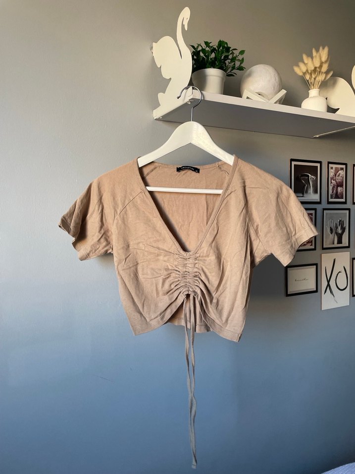 Bej renkli, keten kumaştan, V yaka ve kısa kollu bol kesim kadın bluz. Önde büzgülü drapeli detaylarıyla günlük kullanıma uygun.