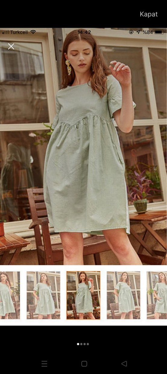 Bej renkli, keten kumaştan yapılmış, V yaka ve kısa kollu midi boy bol kesim elbise. Günlük kullanıma uygun, rahat ve şık bir tercih.