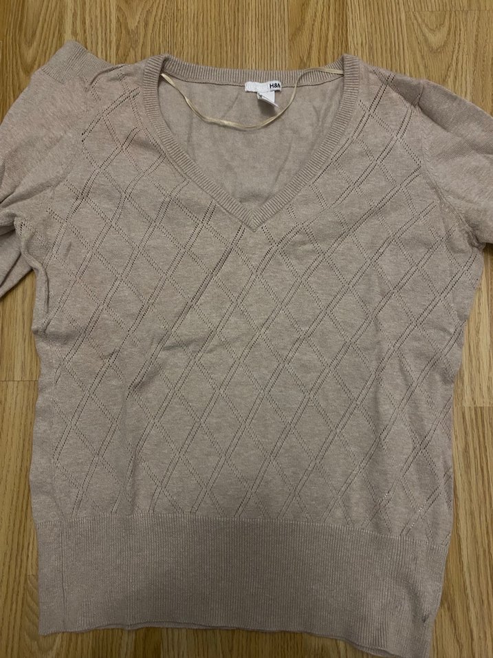 Bej renk, V-yaka, kısa kollu, örgü dokulu ve rahat kesim kadın kazağı. Yumuşak keten kumaştan üretilmiştir, günlük kullanıma uygundur.