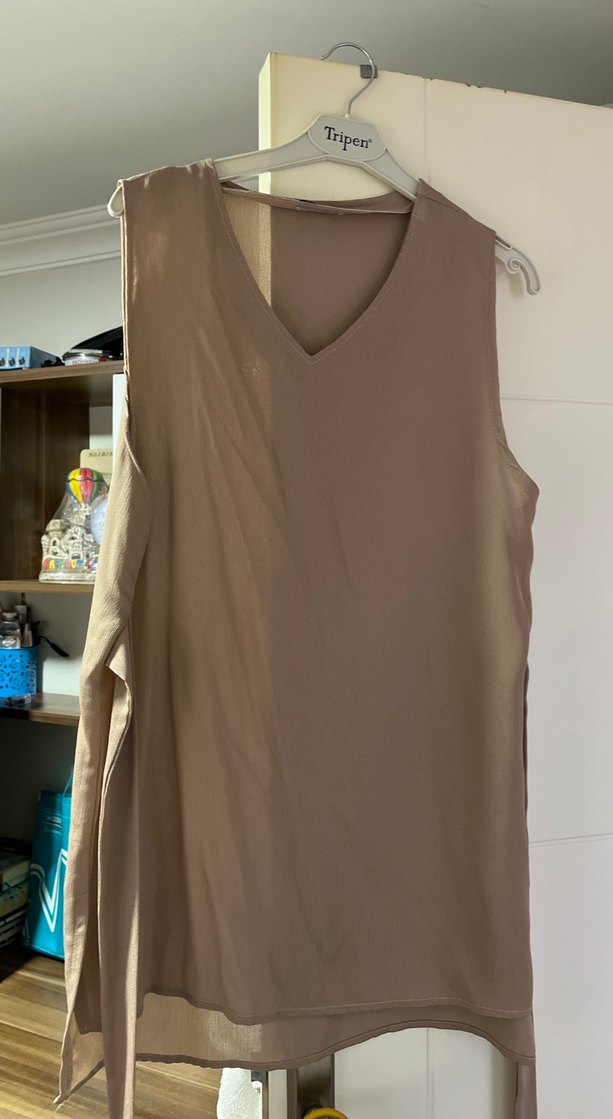 Bej renkli, V yaka ve kolsuz hamile bluzu. Yumuşak keten kumaştan, bol kesim ve drapeli tasarıma sahip, midi boyda rahat bir model.