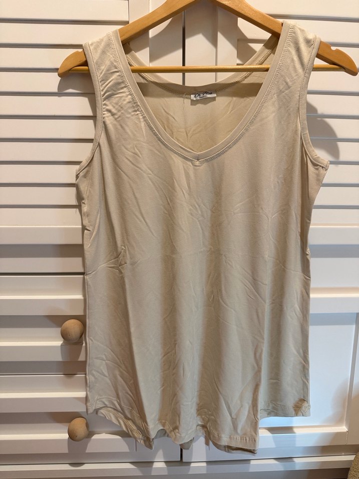 Bej renkte, V-yaka ve kolsuz kadın atlet. Rahat kesimi ve yumuşak keten kumaşıyla günlük kullanım için uygundur. Minimalist ve sade tasarım sunar. Boy 70 cm m ve xl bedenler mevcut
