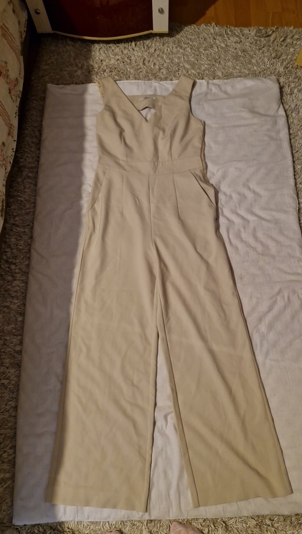 Bej renk, kolsuz ve V yaka kadın tulumu, yumuşak sentetik kumaştan, minimalist ve desensiz tasarıma sahip. Günlük kullanım için rahat ve şık bir tercih. yandaki Fermuarı bozuk sadece alan kişinin Fermuarı yaptırması gerekicek