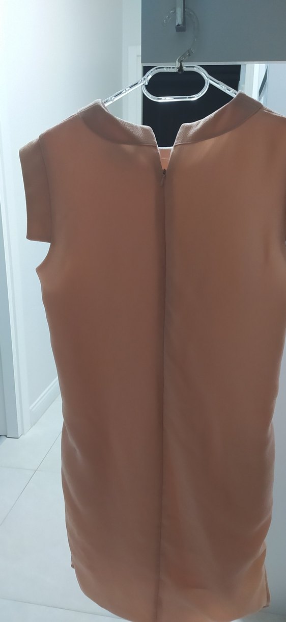 Bej renkli, kolsuz midi kalem elbise V yaka ve drapeli detaylara sahiptir. İpeksi kumaştan üretilmiş, normal kesim ve çağdaş, minimalist tarzıyla ofis için uygundur. ✨