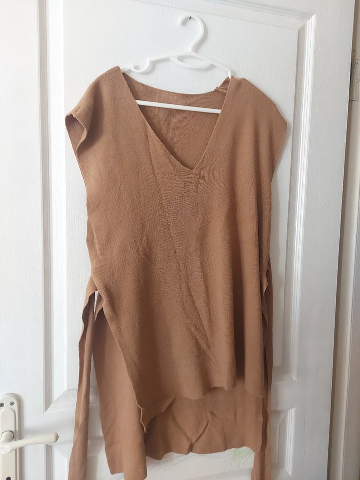 Bej renkli, V yaka ve kolsuz, keten kumaştan salaş kesim süveter. Drapeli tasarımı ve midi boyu ile bohem stiline uygundur.