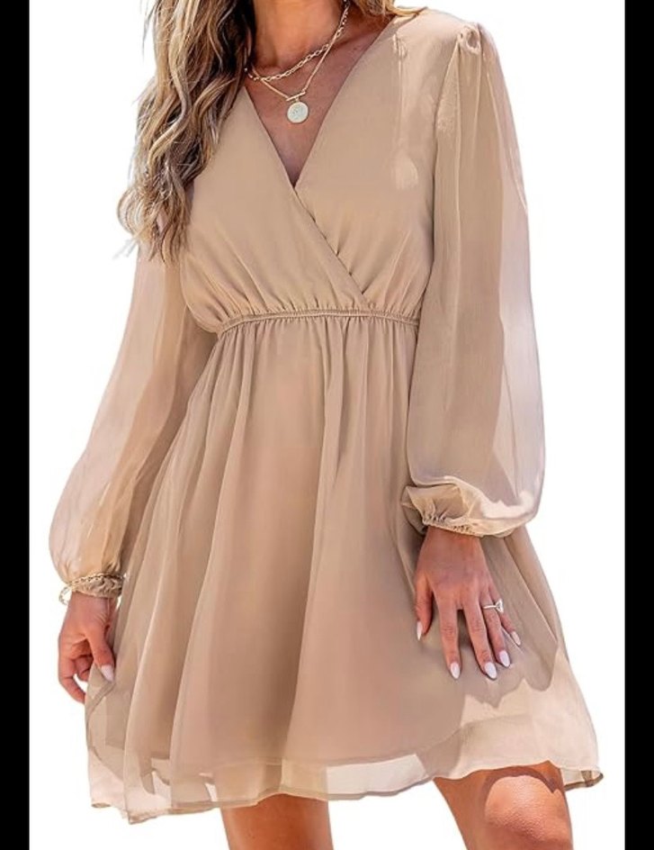 Bej renkli midi boy, V yaka ve uzun drapeli kollara sahip bohem tarzda bol kesim elbise. Yumuşak sentetik kumaştan, günlük kullanıma uygun pastel tonlarda ve desensiz.