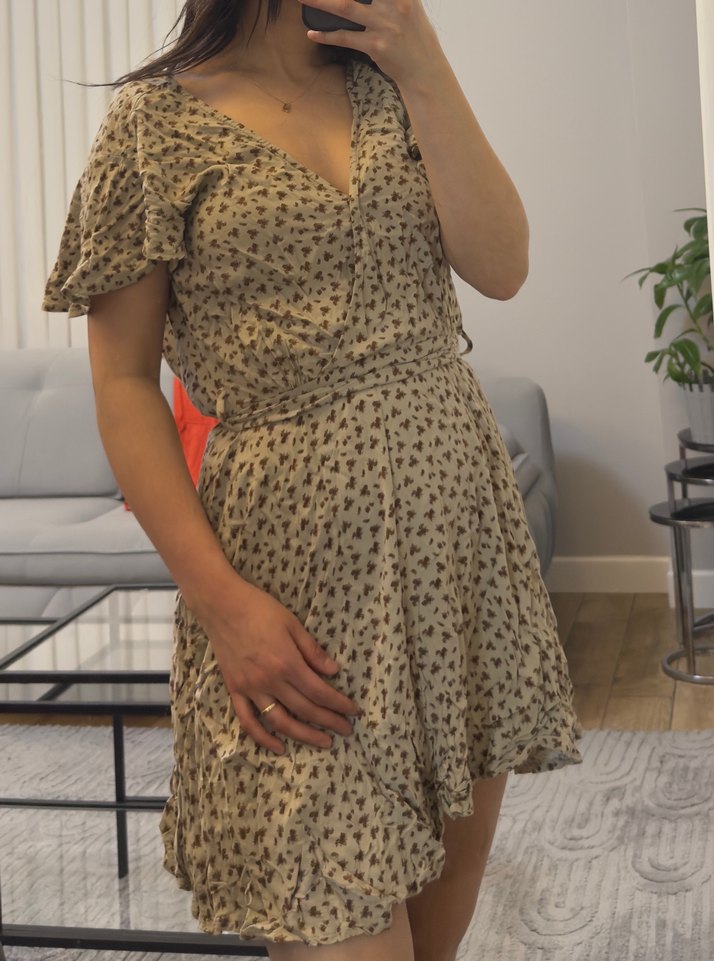 Bej renkli, V yaka ve kısa kollu midi tulum elbise. Bol kesim ve drapeli tasarım, baskılı desenle bohem tarzı yansıtıyor. Yumuşak sentetik kumaştan, günlük kullanıma uygun. Çok az kullanılmıştır, hiçbir defosu bulunmamaktadır.