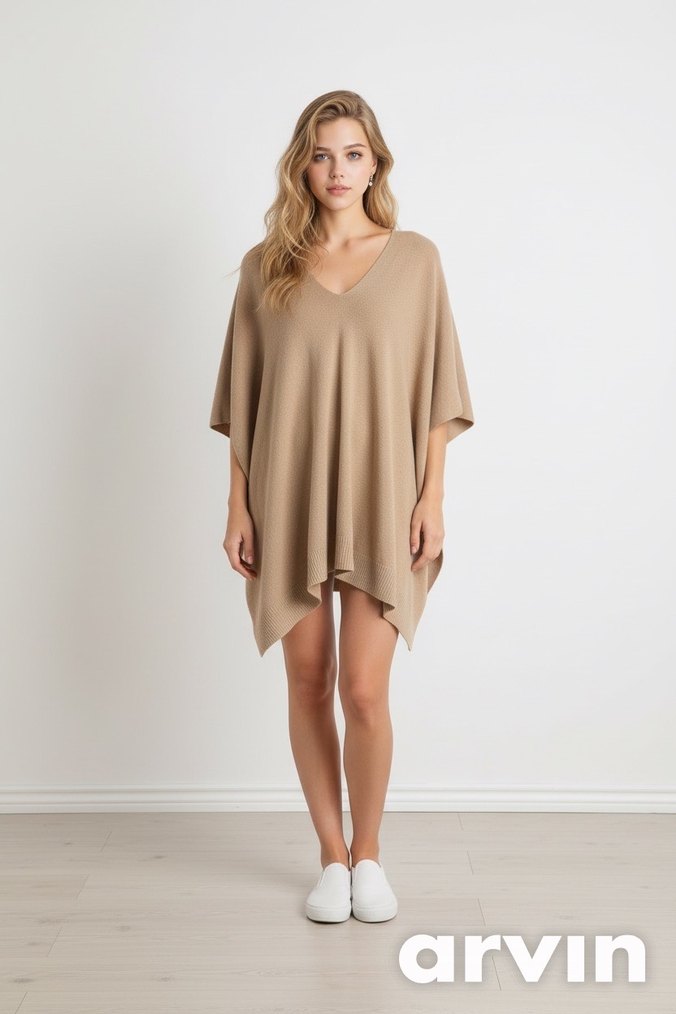 Bej renkte, V yakalı, drapeli ve midi boyda kadın panço. Yumuşak ve ipeksi kumaştan, kısa kollu ve bol kesim, modern ve rahat bir tarz sunar.