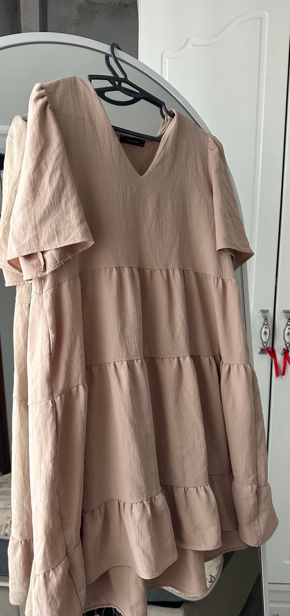 Yumuşak keten kumaştan, bej renkli, V yakalı ve fırfır detaylı bol kesim midi elbise. Kısa kolludur, bohem tarzda.
