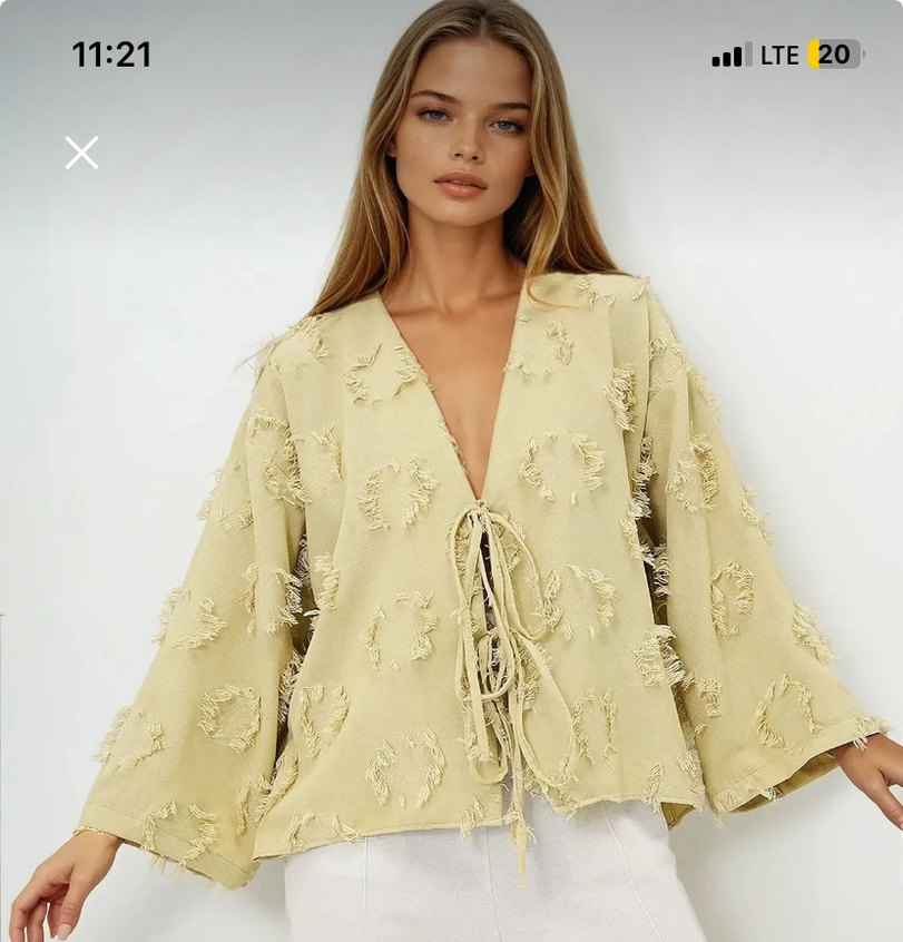 Bej renkli, V yakalı ve uzun kollu, nakışlı dantel detaylara sahip yumuşak keten kumaştan bol kesim kısa boy bohem bluz.