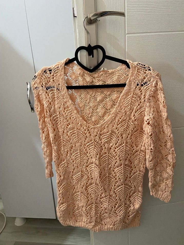 Bej renkli, V yakalı ve uzun kollu örgü kazak. Bol kesimi ve kısa boyuyla rahat, bohem tarzda günlük kullanıma uygun.