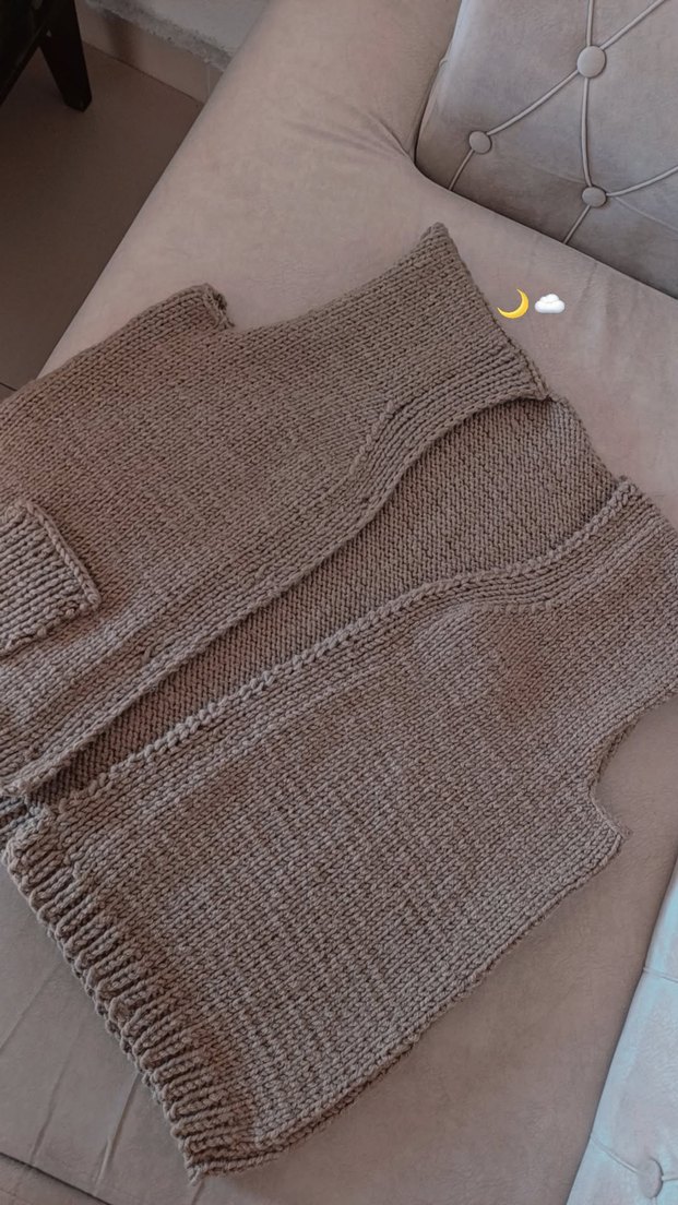 Bej renkli, V yaka, örgü hamile süveter. Kolsuz, normal uzunlukta ve rahat kesimlidir, günlük kullanım için uygundur.