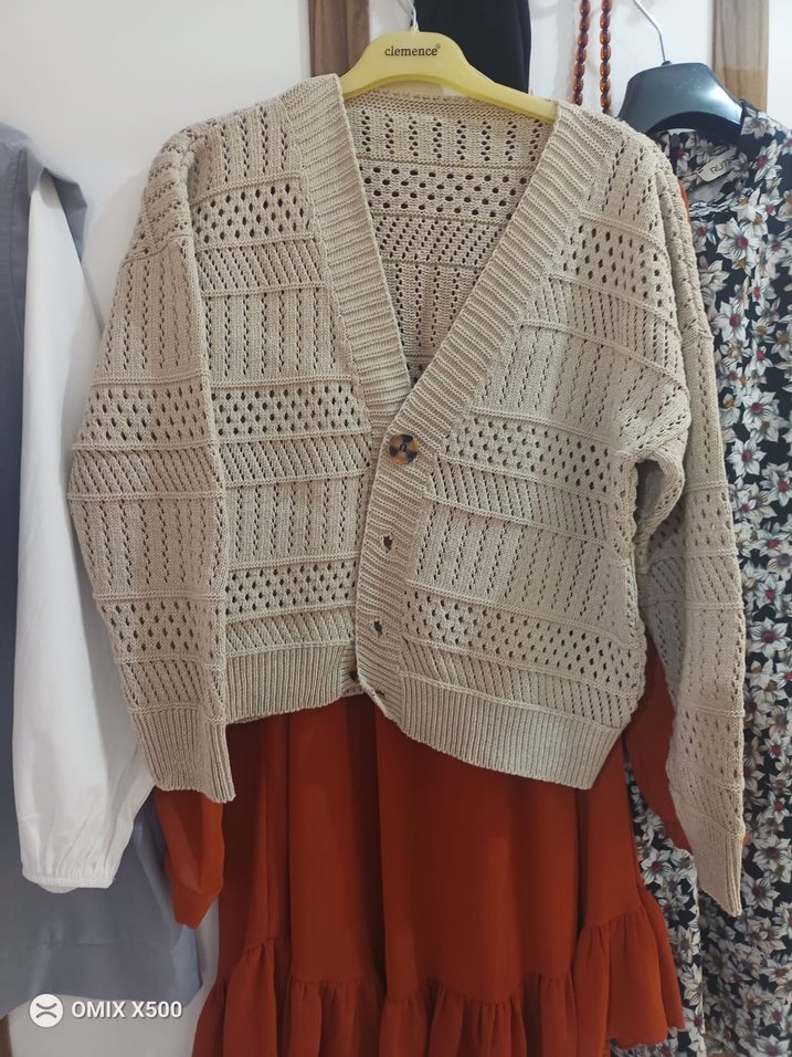 Bej renkli, V yaka, uzun kollu örgü kadın hırka. Salaş kesim ve kısa boyda, bohem tarzıyla günlük kullanıma uygun.