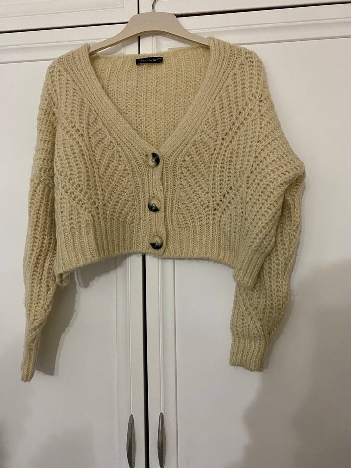 Bej renkli, V yakalı ve uzun kollu örgü kadın hırka. Bol kesimi ve bohem tarzıyla günlük kullanıma uygundur.