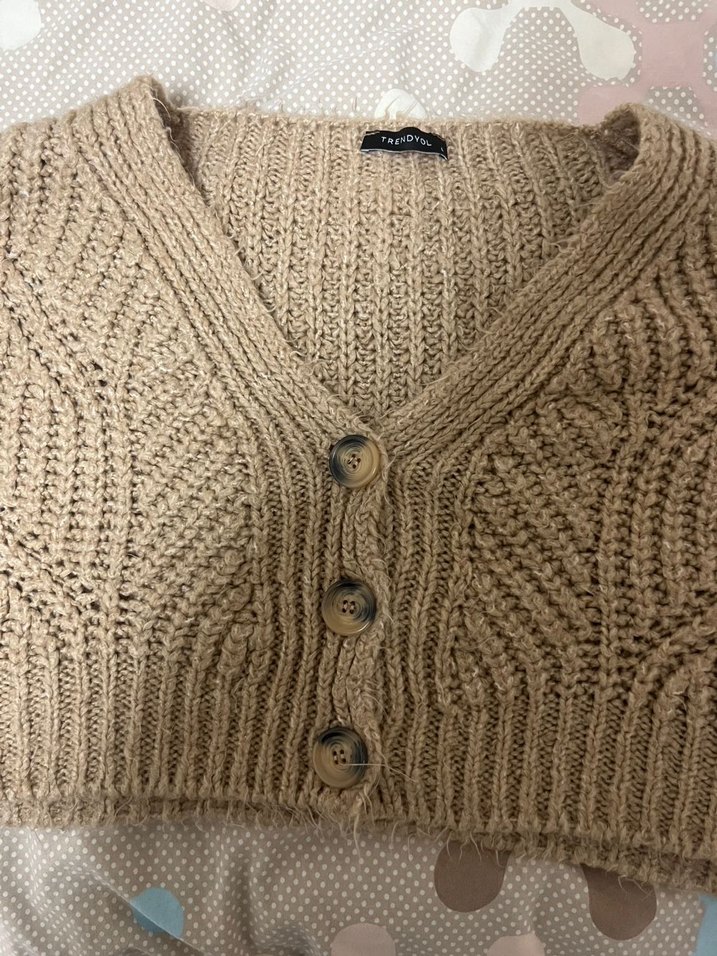 Bej renkli, V yakalı, uzun kollu örgü kadın hırka. Fitted kesim ve rahat dokusuyla günlük kullanıma uygun bohem tarzda.