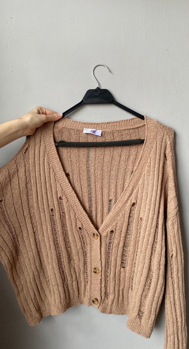 Bej renkli, V yakalı ve uzun kollu örgü kadın hırka. Rahat, midi boy ve desensiz tasarımıyla günlük kullanıma uygundur.