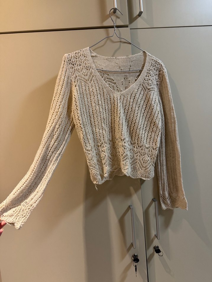 Bej renkli, V yaka ve uzun kollu, bol kesim örgü kadın kazak. Hiçbir hasarı bulunmamaktadır. Bohem tarzı ve yumuşak dokusuyla günlük kullanıma uygundur. Esneyebilecek bir yapısı vardır içi tiril tiril bir kumaştır. (öğrenciden satılık)
